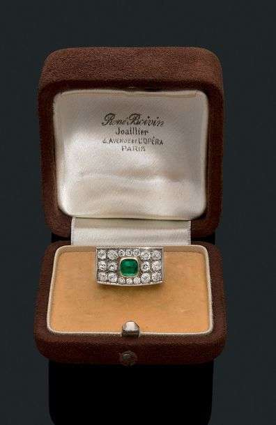 Bague "chevalière" Emeraude cabochon, pavage de diamants de taille ancienne, or 18k (750) et platine (950). Vers 1950. Non signé. Ecrin d'origine. Td.: 53 - Pb.:11gr. Accompagnée d'un certificat Cailles - Salit attestant qu'il s'agit d'une création René Boivin. An emerald, diamond, gold and platinum ring by Rene Boivin. Circa 1950.