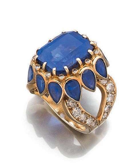 Bague, Saphir rectangulaire à pans coupés, entourage diamants ronds et saphirs poires, or 18k (750). Poinçon de maître. Vers 1965 -70. Poids du saphir: 17.5 cts env. (non pesé). Td.: 54 - Pb.: 21.8gr. Certificat du laboratoire LFG N°362957 attestant: Origine: Ceylan, Pas d'indication de traitement - Bleu vif. Accompagné d'un certificat Cailles - Salit attestant qu'il s'agit d'une création René Boivin.