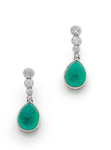 Cabochon d'émeraude en goutte, chute de diamants taille ancienne, or gris 18k (750).