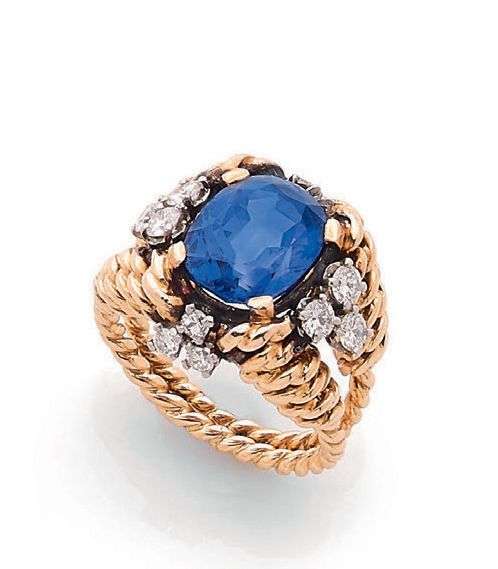 Saphir ovale, diamants, or 18k (750) et platine (850).