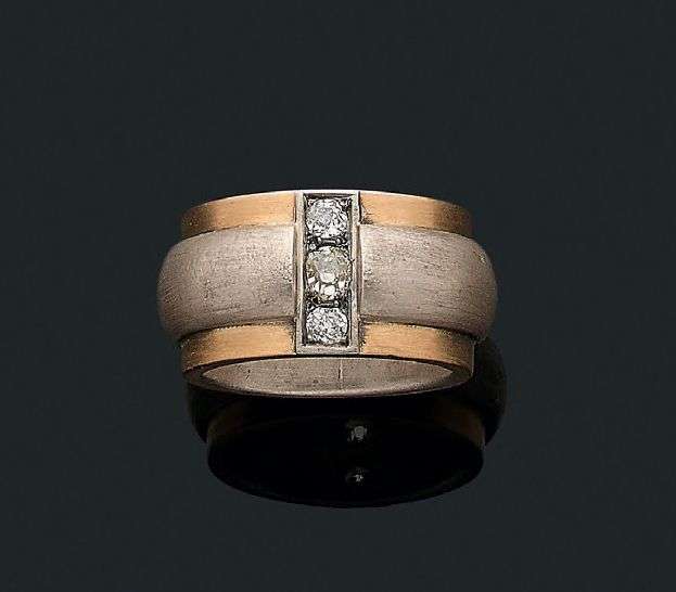 Diamants de taille ancienne, or 18K (750) brossé deux tons . Vers 1935.