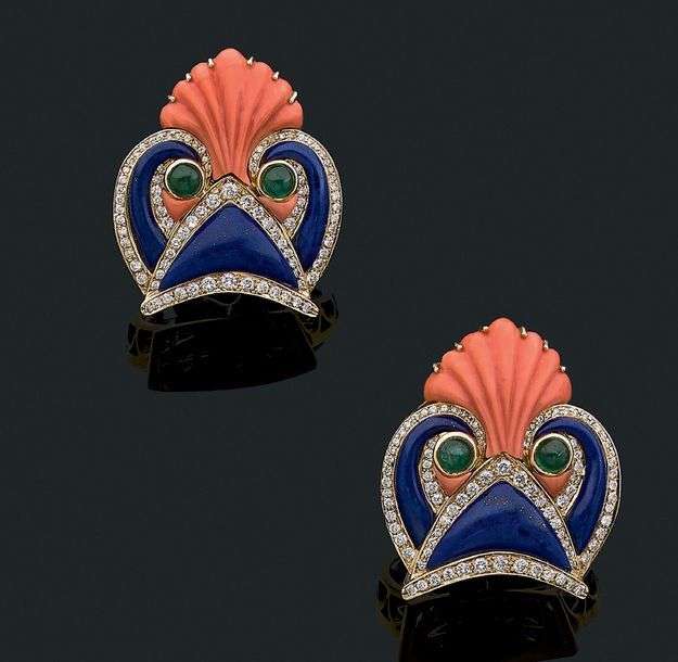 A coral, lapis lazulis, emerald, diamond and gold ear clips.