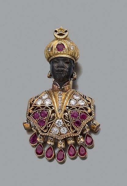 A ruby, diamond and gold clip by Nardi, signed. Lack of one stone.