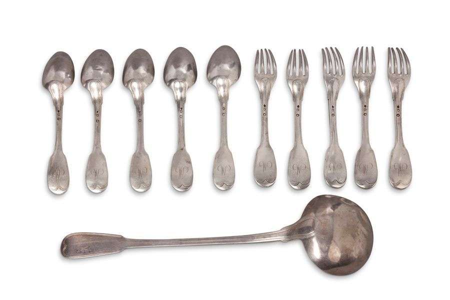 • ENSEMBLE DE CINQ COUVERTS ET UNE LOUCHE en argent armorié, modèle à filet.