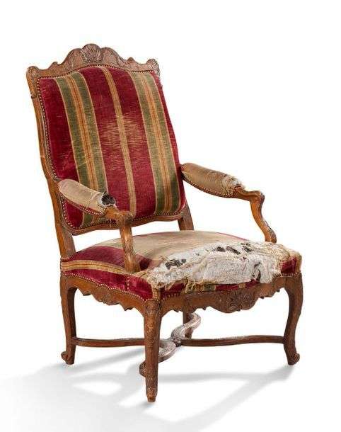 FAUTEUIL en bois naturel mouluré et sculpté à décor de coquilles et d'acanthes sur fond quadrillé. Bras et pieds cambrés réunis par une entretoise en X.