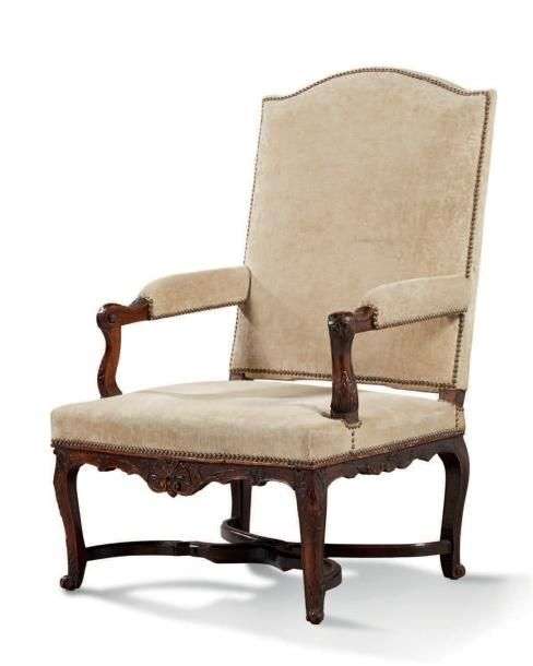 FAUTEUIL À DOSSIER PLAT en noyer mouluré et sculpté reverni, à décor d'acanthe et lambrequins, la ceinture ornée d'une coquille repose sur quatre pieds à enroulements reliés par une entretoise en X.