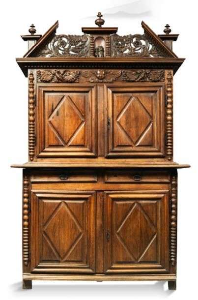 BUFFET À DEUX CORPS en noyer mouluré et sculpté ouvrant par quatre vantaux et deux tiroirs. Montants à colonnettes tournées, corniche à décor de masques, oiseaux, guirlandes et fronton interrompu à décor d'enroulements feuillagés.