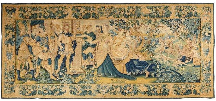 TAPISSERIE illustrant la scène de l'Histoire de Rome, présentant le dernier roi Tarquin «le Superbe «et son épouse «Tullia la Jeune». Ils sont identifiables grâce à la scène d'arrière plan à droite: Tullia fait passer son char sur le corps de son propre père le roi «Servius Tullius».