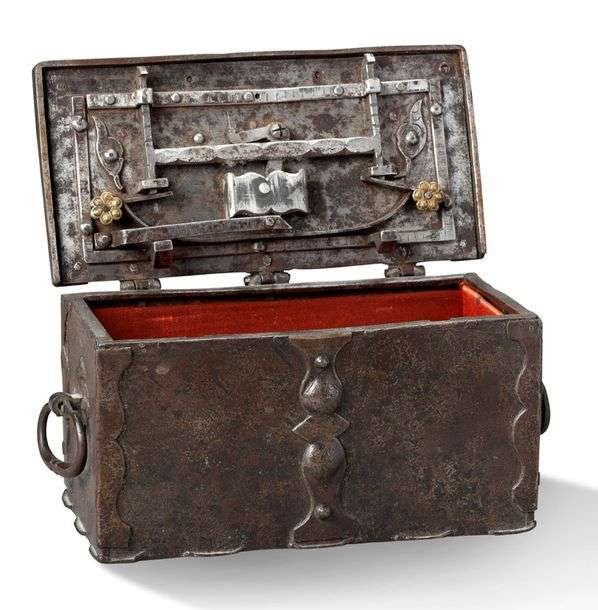COFFRET en fer forgé. Serrure sous le couvercle ouvrant à deux pennes avec