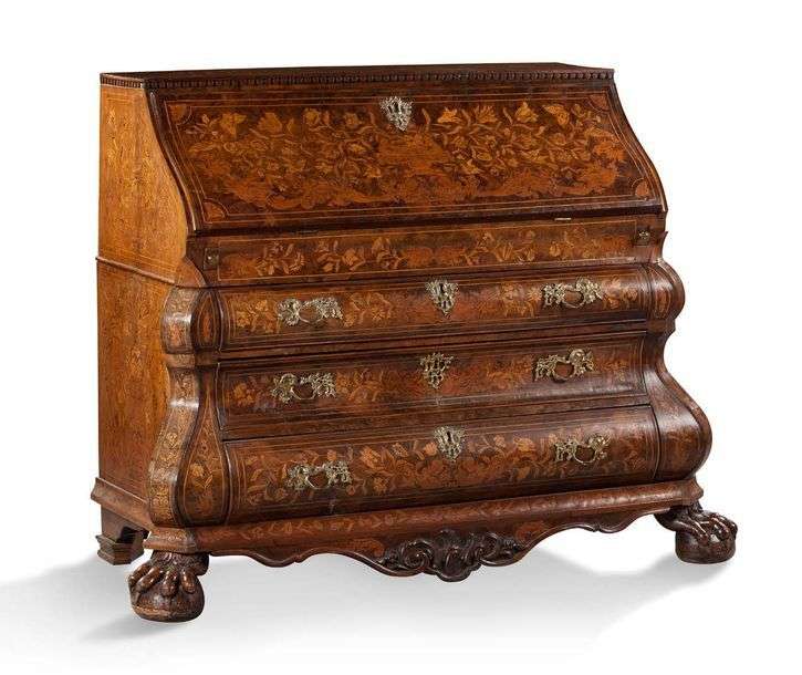 Elle ouvre en façade par un abattant découvrant dix tiroirs et deux casiers. Trois tiroirs en partie inférieure. Montants galbés terminés par des pieds griffes reposant sur des sphères aplaties.