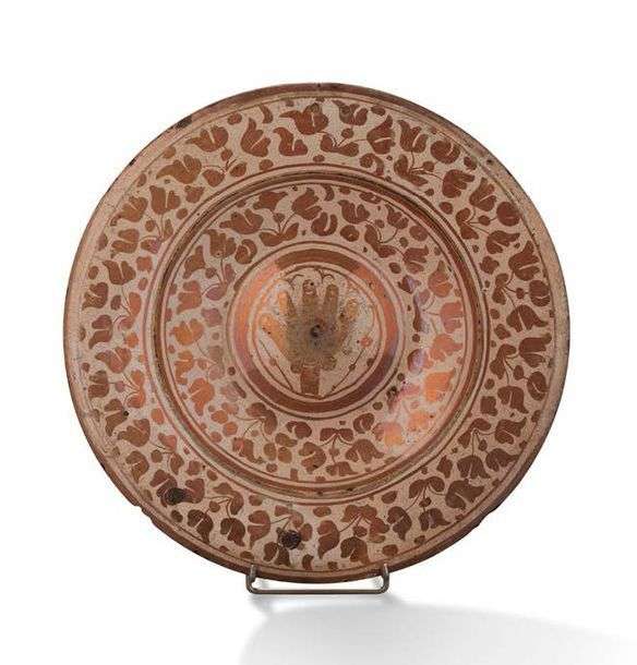 DEUX PLATS HISPANO-MAURESQUES en faïence lustrée à reflets métalliques. L'un à ombilic à décor végétal sur toute la surface extérieure. L'autre à décor rouge brun d'un bouquet d'oeillets