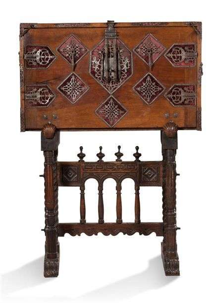 BARGUENO en noyer, l'abattant à serrure à moraillon est orné de médaillons stylisés en bronze, il découvre quinze tiroirs et casiers à décor marqueté en os de façades architecturées à doubles colonnettes torsadées. Prises en fer forgé formées de coquilles en souvenir des coffres portatifs des pèlerins de Saint-Jacques de Compostelle.