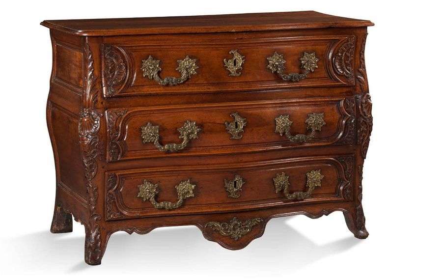 IMPORTANTE COMMODE en bois naturel mouluré sculpté de coquilles et acanthes. Elle ouvre en façade par trois tiroirs, montants galbés à côtes pincées. Ornementation de brobzes ciselés et dorés tels que: entrées de serrure, poignées de tirage et culs de lampes.