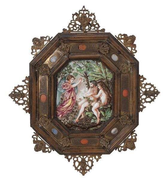 Dans un cadre octogonal en bronze ciselé et doré de style Renaissance (manques)