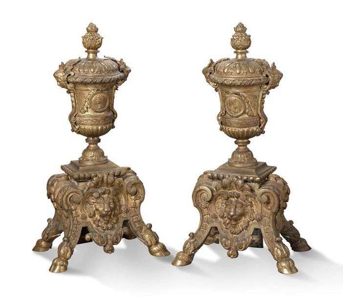 PAIRE DE CHENETS en bronze ciselé et doré ornée d'une amphore à l'antique à décor de profils dans des médaillons et de masques reposant sur des consoles à volutes terminées par quatre pieds biche.
