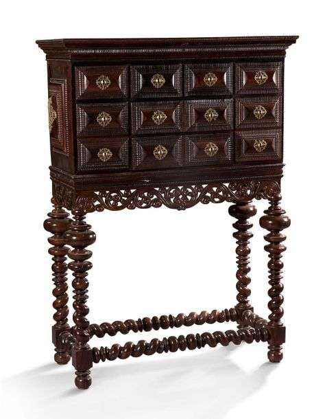 IMPORTANT CABINET en palissandre mouluré sculpté de frises. Il ouvre en façade par huit tiroirs sur trois rangs. Entrées de serrures en laiton doré.