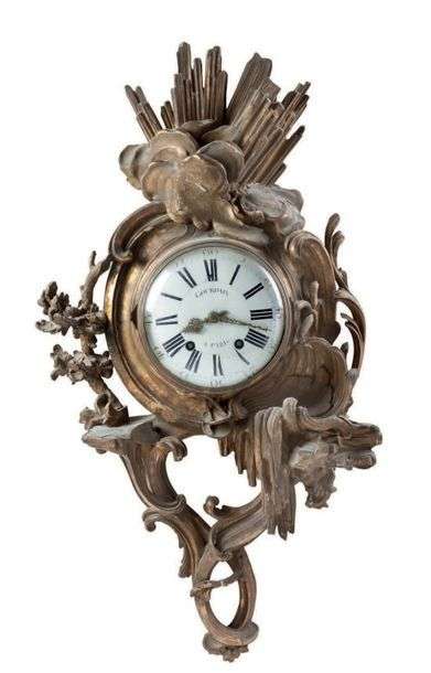 IMPORTANT CARTEL en bois sculpté et doré à décor rocaille de chutes, acanthes, roseaux et nuées. Le cadran de Gourdain à Paris.