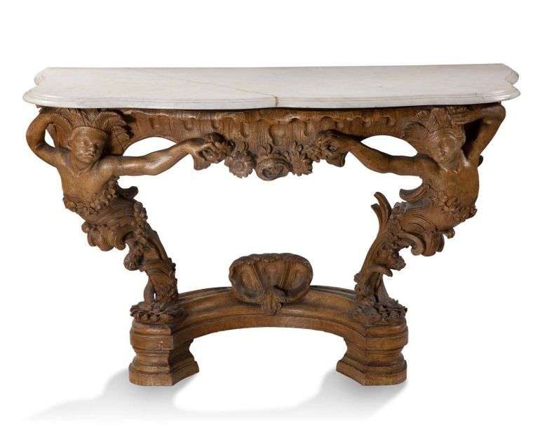 CONSOLE en chêne naturel mouluré et sculpté anciennement laqué à décor de deux bustes d'amérindiens empanachés réunis par une guirlande de fleurs, piètement semi-circulaire orné d'une coquille.