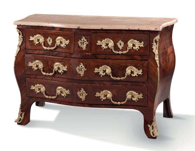 COMMODE GALBÉE en placage de bois de violette marquetée en feuillle.