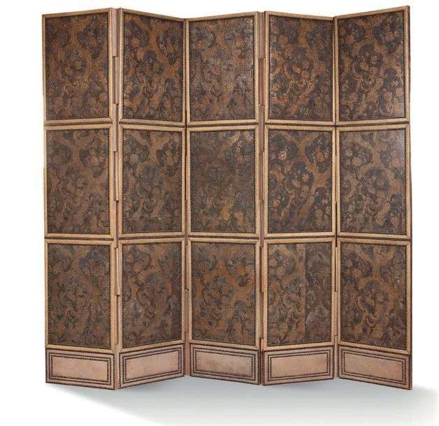 IMPORTANT PARAVENT à cinq feuilles gainées de panneaux de cuir polychrome
