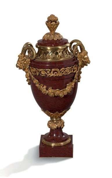 IMPORTANTE URNE COUVERTE en marbre rouge antique et bronzes ciselés dorés. La panse est ornée d'une frise ajourée de fleurettes et feuillages. Les anses formées de têtes de boucs sont réunies par une riche guirlande de fleurs. Le col est orné d'une large bague à frise d'entrelacs et rang de perles. Prise formée d'une graine. Base circulaire à décor d›un jonc rubanné. Contre socle carré.