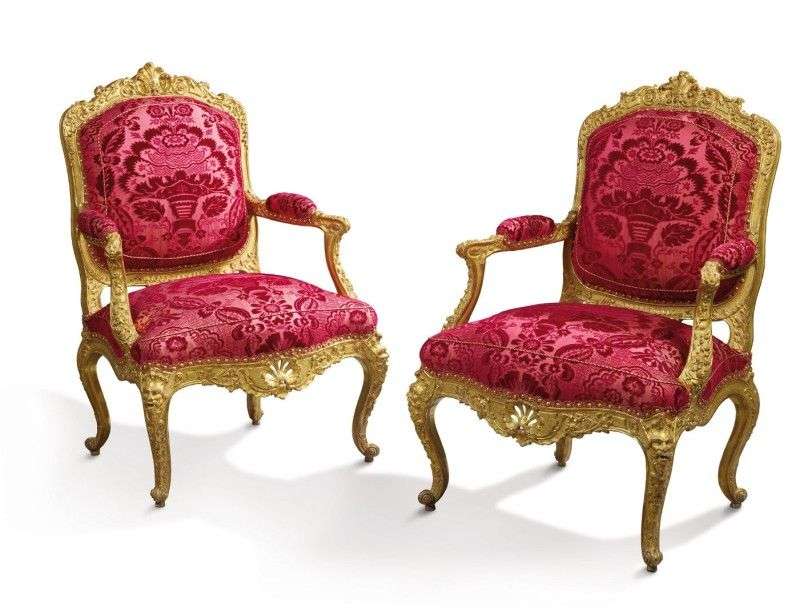 Rarissime paire de fauteuils à dossier plat, très finement sculpté et doré, sur toutes ses faces, à décor, à l'amortissement d'une coquille dans des encadrements latéraux à larges volutes à feuilles d'acanthe sur des fonds de grattoirs. Les épaulements feuillagés. Attaches d'accotoir à feuilles d'acanthe et rosace. Les supports à chutes festonnées, soulignées de feuillages. Bras cambrés à ombilics et chicorée, à enroulement à la partie inférieure. Les ceintures chantournées, ajourées, sur trois faces, présentant des coquilles sur des fonds de lambrequins. Les têtes de pied à masque de satyre ailé. Les traverses et l'arrière des dossiers, reparés de croisillons à pois et festons, soulignés de filets et de feuillages Travail allemand, du XVIIIe siècle Garniture en velours ciselé Bordeaux, anglaisé H: 105 - L: 71 - P: 57 cm Provenance: Ancienne collection Fischer-Böhler Suite à la Guerre de trente ans (1618-1648) et au traité de Westphalie (1648), le Saint-Empire germanique fut fractionné en de multiples états ou principautés. A l'époque, l'on comptabilisait près de 311 états représentés à la Diète générale et plus de 1200 seigneurs non représentés, chacun désireux d'affirmer son autorité politique et de posséder sa cour, ses palais et ses propres artistes. C'est dans ce contexte d'effervescence que virent le jour certains grands foyers artistiques représentatifs du goût du prince dirigeant, notamment à Berlin, Dresde, Ansbach, Augsbourg et Munich. Cette dernière ville, située en Bavière, était la riche capitale d'un état ou « électorat » dirigé par un prince-électeur. Depuis 1679, c'était Max-Emmanuel (1662-1726), plus connu sous le nom de Maximilien II, qui dirigeait la principauté. Ce prince était entièrement acquis à l'art français, mais les nombreuses et coûteuses guerres auxquelles il prit part, puis son exil à Paris imposé par l'Empire, l'empêchèrent dans un premiiier temps de mener à bien son dessein: recréer dans ses résidences le luxe et le faste français. Au