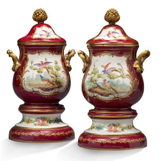 • PAIRE DE VASES COUVERTS SUR PIÉDOUCHE en porcelaine de Sèvres.