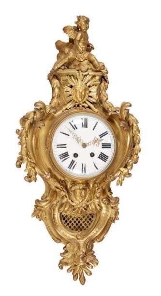 IMPORTANT CARTEL D'APPLIQUE de forme violonnée en bronze ciselé et doré à riche décor rocaille de volutes feuillagées, chutes et agrafes sur fond quadrillé. Il est surmonté d'un putto. Le cadran émaillé blanc présente les heures en chiffres romains, il est orné en partie haute par un masque rayonnant et en partie basse par un masque empanaché.