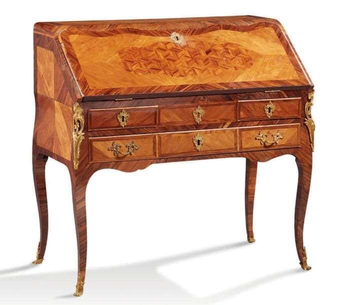 BUREAU DE PENTE à toutes faces, en placage de bois de rose marqueté de cubes en trompe l'oeil sur des contres fonds marquetés en feuilles. Il ouvre par un abattant qui dissimule six tiroirs et cinq casiers. Trois tiroirs en ceinture, sur deux rangs.