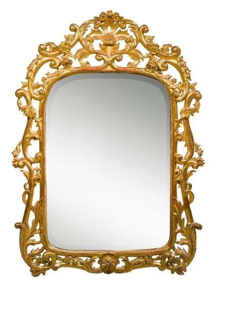 MIROIR RECTANGULAIRE en bois sculpté et doré à décor ajouré d'une large coquille à l'amortissement d'où s'échappent des rinceaux et fleurettes.