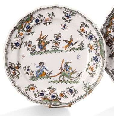 MOUSTIERS ASSIETTE en faïence à bordure contournée décorée en polychromie de deux grotesques et de deux oiseaux fantastiques encadrés de fleurs et de papillons.