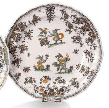 MOUSTIERS, ASSIETTE en faïence à bordure contournée décorée en vert et ocre de trois grotesques et d'un oiseau fantastique encadrés de fleurs et de papillons.