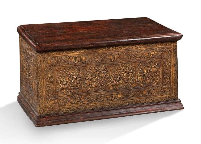 COFFRE RECTANGULAIRE en bois, les côtés laqués or, à décor sculpté en léger relief d'apsaras et danseurs parmi des nuées sur fond quadrillé, sur les grands côtés, des chimères affrontées ornant les petits côtés, les panneaux entourés d'une bordure de palmettes et rinceaux stylisés, le couvercle et le socle en bois naturel patiné.
