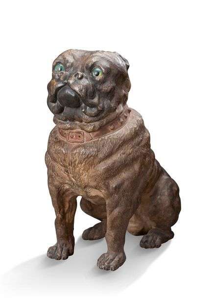 DEUX BOULEDOGUES en terre cuite patinée, les yeux en perles de verre.