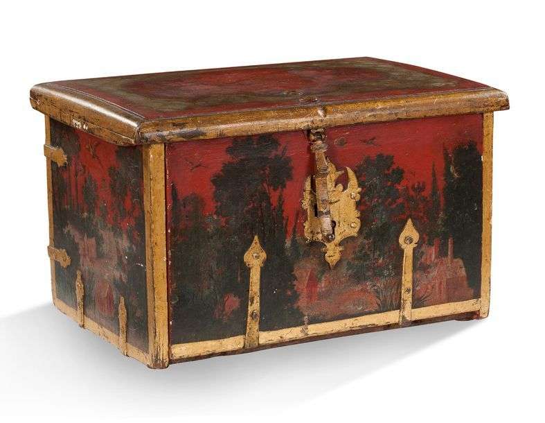 COFFRET en bois laqué doré et polychrome à fond rouge à décor de paysages et bouquets de fruits et de fleurs.