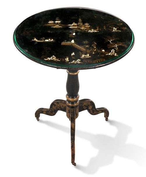 PETITE TABLE GUÉRIDON en bois laqué noir et décor peint or de scènes animé