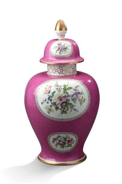 • IMPORTANTE POTICHE COUVERTE en porcelaine à fond rose à décor de bouquets de fleurs dans des médaillons.