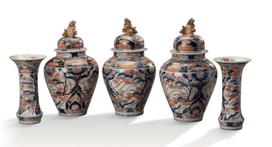GARNITURE DE CHEMINÉE en porcelaine à décor Imari du Japon, elle se compose de trois potiches couvertes, le couvercle surmonté de chiens de Fo et de deux vases cornet.