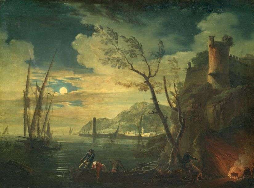 Vue de pêcheurs amarrant au clair de lune Toile 48 x 65,5 cm