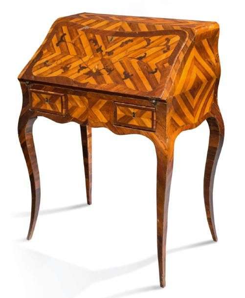 BUREAU DE PENTE en marqueterie de bois de rose et de satiné. L'abattant présente un décor de branchages fleuris dans des bandes obliques alternées. Il découvre des casiers et cinq petits tiroirs dont un formant coffre. La ceinture chantournée présente deux tiroirs en façade. Il repose sur quatre pieds cambrés.
