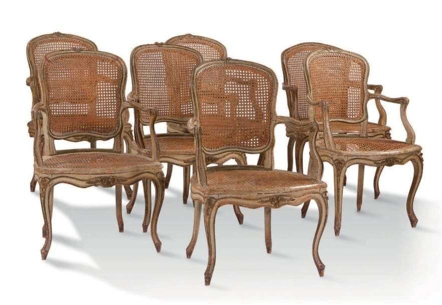 ENSEMBLE de sept fauteuils en bois mouluré sculpté laqué gris et rechampis