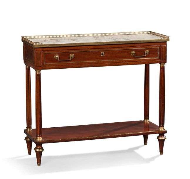Elle ouvre par un tiroir en façade et repose sur des pieds fuselés à cannelures réunis par une tablette d'entretoise.