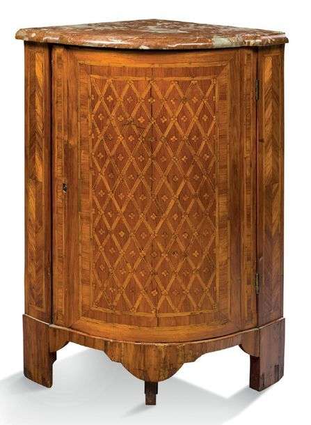 ENCOIGNURE à façade galbée en marqueterie de losanges et fleurettes.