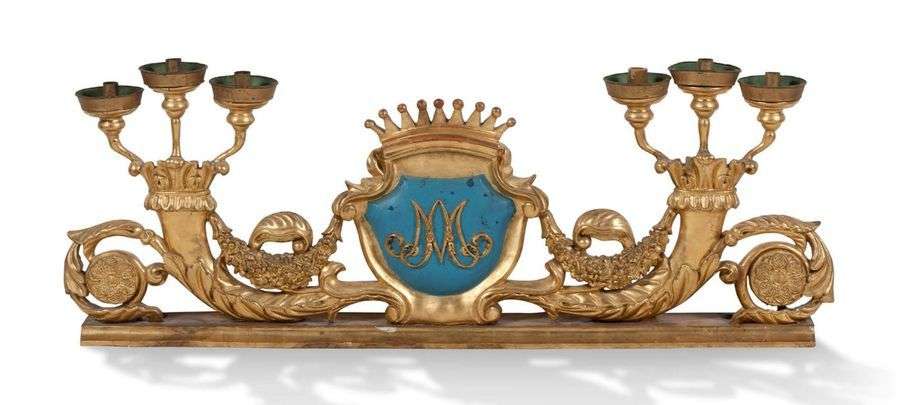 PAIRE D'IMPORTANTS FLAMBEAUX DE TABLE en bois sculpté et doré à six bras de lumière supportés par des cornes d'abondance enguirlandées de fleurs| au centre se trouve un médaillon couronné au chiffre de Marie-Antoinette MA sur fond bleu roi.
