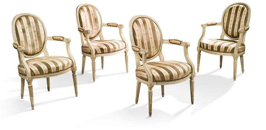QUATRE FAUTEUILS À DOSSIER MÉDAILLON en bois mouluré sculpté et laqué crème. Ceinture à dés de raccordement à rosaces, pieds fuselés à cannelures rudentées.