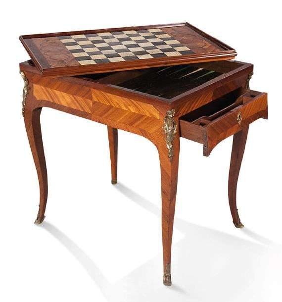 TABLE À JEU DE TRIC TRAC en marqueterie de bois de rose et de satiné.