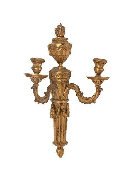 PAIRE D'APPLIQUES en bronze ciselé et doré à fût cannelé et coiffé d'une urne flammée.