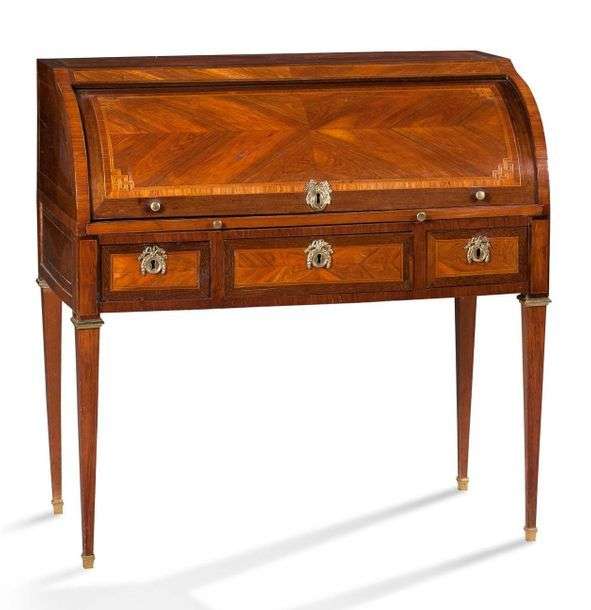 BUREAU CYLINDRE en placage de bois de rose marqueté en ailes de papillons dans des encadrements de filets et de grecques sur fond d'amarante. Le cylindre ouvre et découvre trois tiroirs. Et la ceinture droite ouvre par trois tiroirs en façade. Ornementation de bronzes ciselés dorés. Il repose sur quatre pieds gaines.