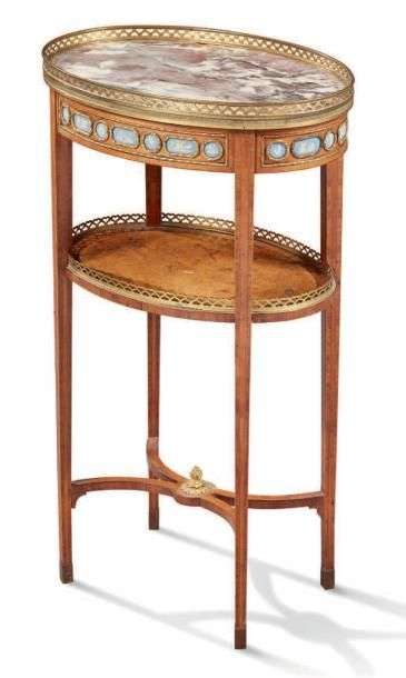 PETITE TABLE DE SALON de forme ovale en marqueterie de bois de placage. La ceinture est ornée de petits médaillons en Wedgwood. Le plateau de marbre rose veiné gris à galerie de bronze ajourée. Elle repose sur quatre pieds fuselés réunis par une entretoise en X et une tablette à galerie.