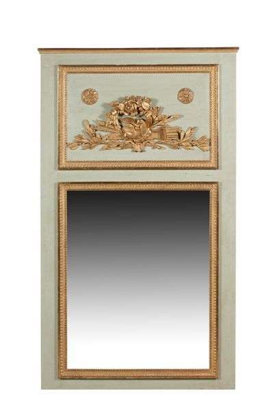 TRUMEAU DE CHEMINÉE en bois mouluré sculpté doré et laqué vert orné en partie haute d'une composition au carquois, volatiles et couronnes de fleurs et en partie basse d'un miroir au mercure.